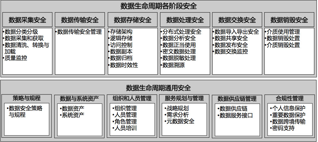 七個安全過程維度:數(shù)據(jù)采集安全、數(shù)據(jù)傳輸安全、數(shù)據(jù)存儲安全、數(shù)據(jù)處理安全、數(shù)據(jù)交換安全、數(shù)據(jù)銷毀安全、通用安全,共計30個過程域;